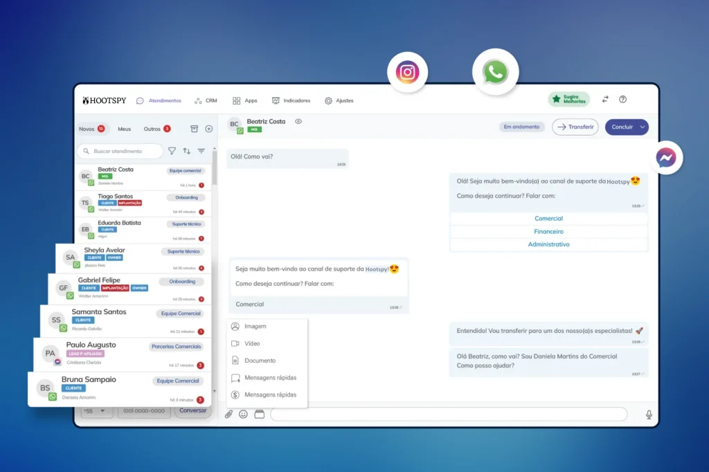 Reúna WhatsApp, Instagram Direct e Messenger em um só painel, com histórico, dados em tempo real e sem perder nenhuma conversa.